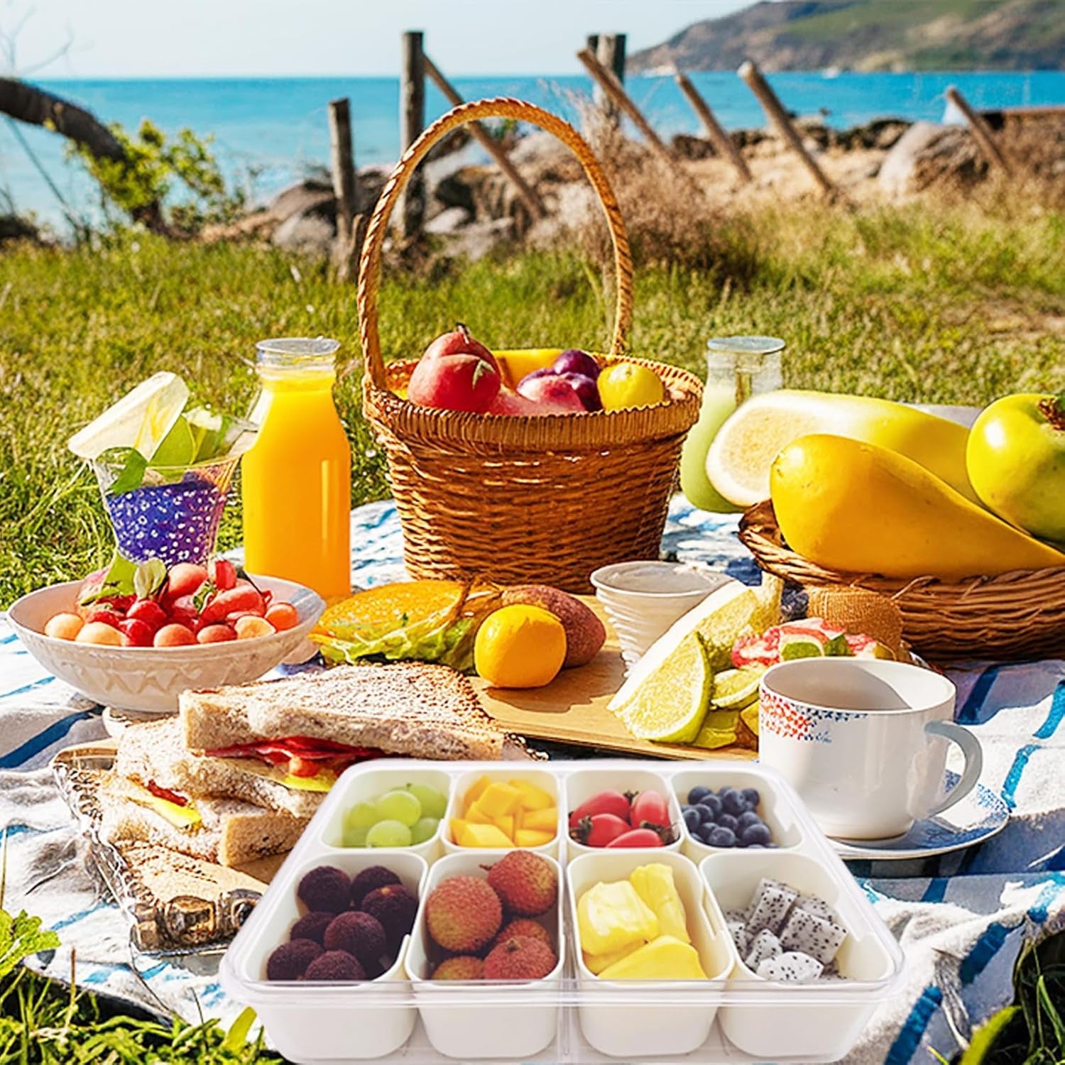 6-Separate Compartments: The storage box features eight individual sections, perfect for organizing small food items like fruits, vegetables, cheeses, nuts, and snacks.
