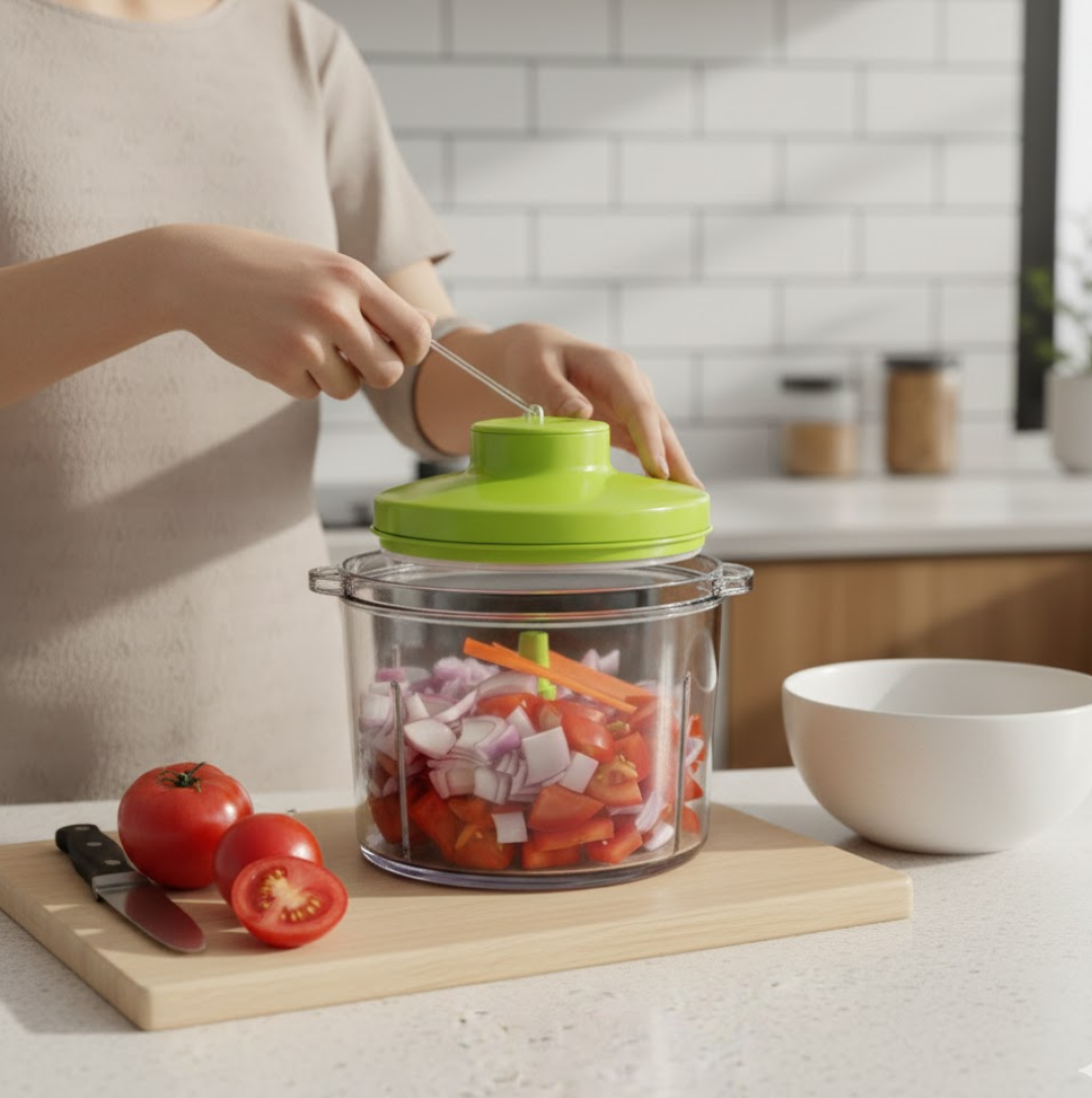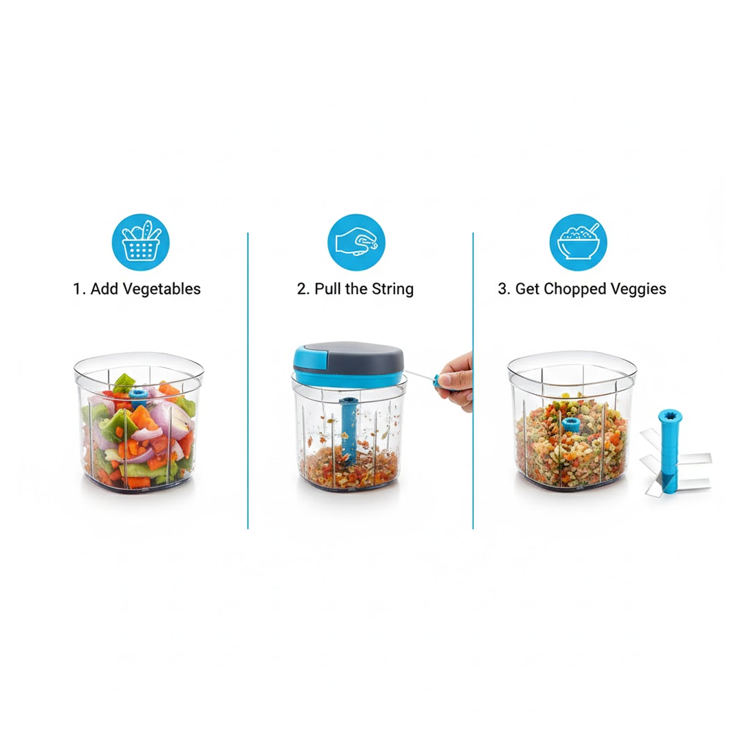 GANESH Master Chopper is Ideal for chopping and cutting onion, vegetables, dry fruits, nuts, herbs, etc. It has Sturdy Stainless Steel Blades for quick and efficient chopping. It provide Tear Free Chopping for Onions, Garlic, Chilly, Etc. Make it instant-Paste, Chopping, Gravy, Salad, Chutney, Food Preparations, etc. using Master Chopper. Easy to Clean and Disassemble. Master Chopper is made From Food grade BPA free Virgin Material. No Electricity required. It has Non-skid base. It gives about More Than 380 Knife Cuts in less than 20 Sec. It Cuts and Chops with easy hand pull Cord function. Sturdy 5-blade design made from Stainless Steel With Large Capacity. Use and Care : Take the Chopper Container and Fix blade holder in the Centre. Cut the ingredient in to appropriate size and add evenly around the blade. Don't Fill the bowl more than 3/4 of bowl Capacity. Pull handle Parallel to bowl. Sharp blades handle with Care. Keep out of the reach of Children.