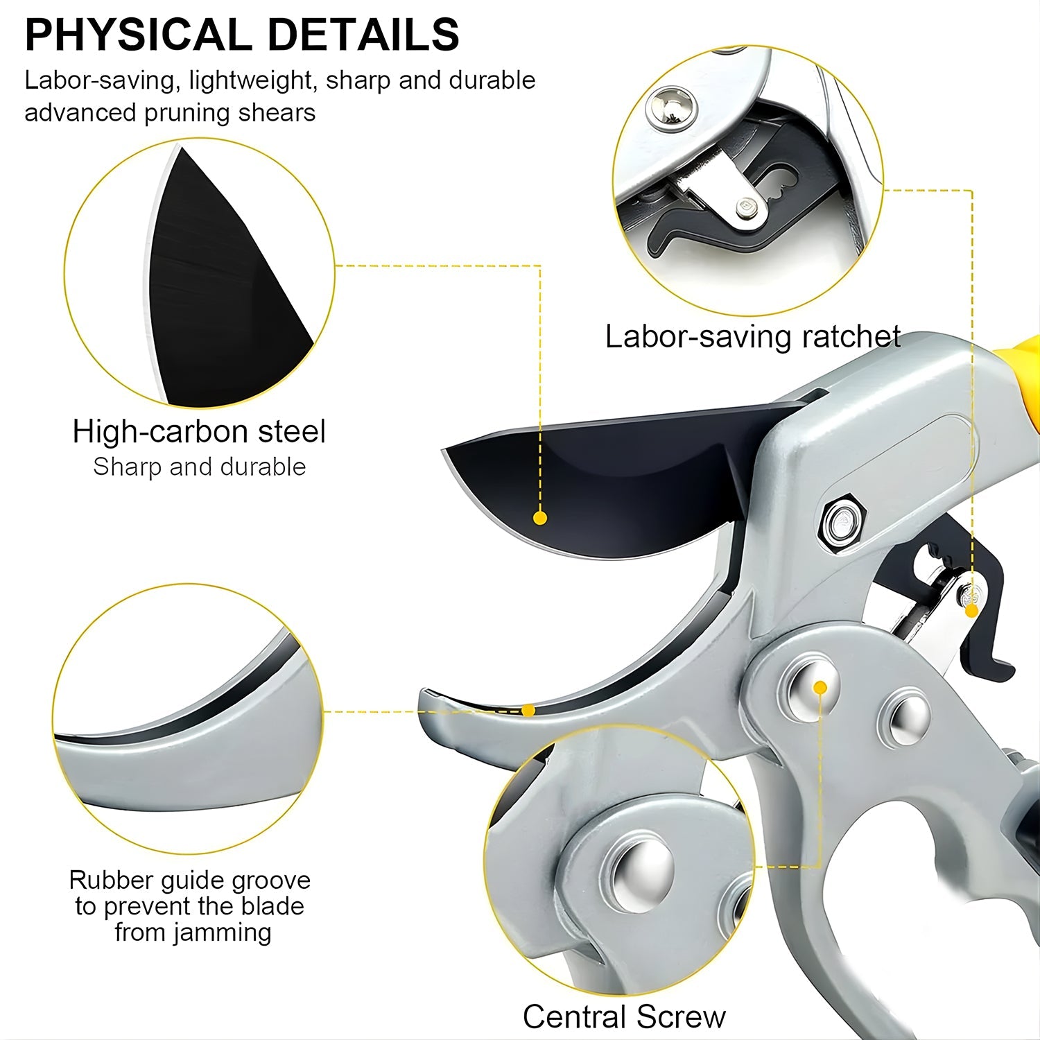 • [Quality Blades] - Professionally built utilizing SK-5 Steel that meets the highest standards and gives you precision on each cut. Ideal use for light branches of trees, rose bush, shrubs, and hedges. Incredibly sharp tree trimmers with High Carbon Steel Blade with non-stick protective coating. Razor sharp curved cutting blade maximizes cutting effectiveness, cuts cleanly every time without crushing plant material.