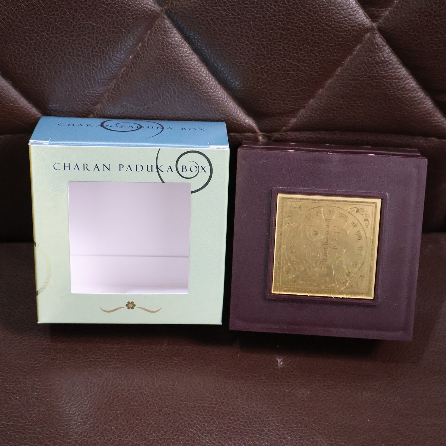 • Material: Wooden box with gold-plated Charan Paduka & embossed metal art