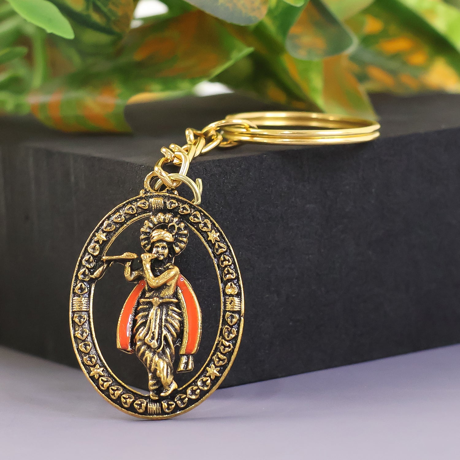 Metal Traditional Decorative Lord Krishna Keychain with Antique-Finish Oval Frame, Premium Religious Key Ring for Keys, Bags, Vehicles & Gifting – Single Piece