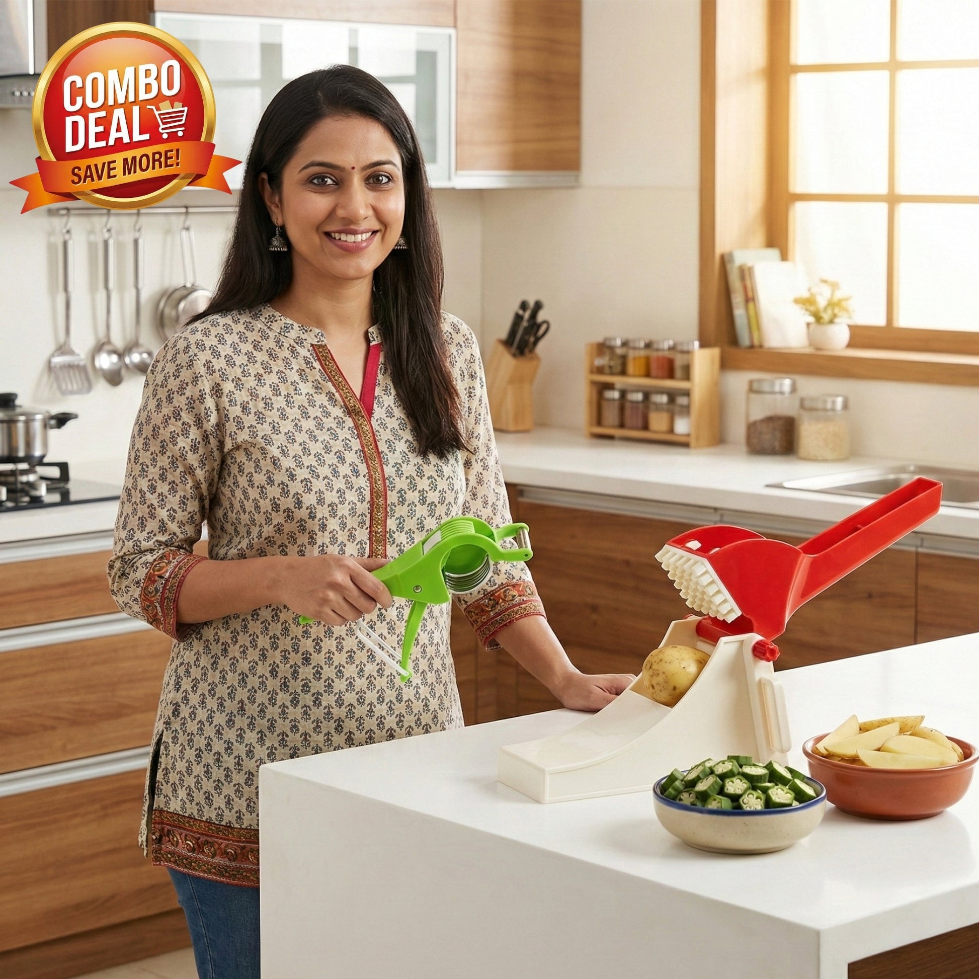 "I used to hate cutting Bhindi (Okra) because it took forever. With the green cutter, I'm done in minutes, and the kids love making their own fries with the chipser!"